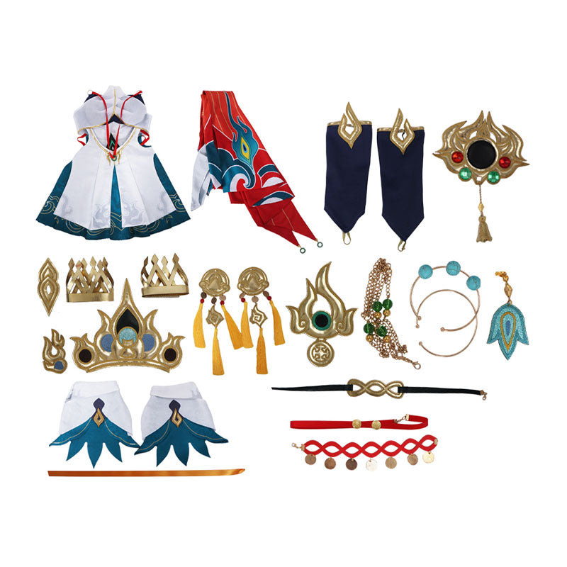 • Package Include: Skirt, cloak, sleeves, chest decoration, headdress, waist decoration, wrist decoration, arm decoration, necklace, ear clips, leg decoration.