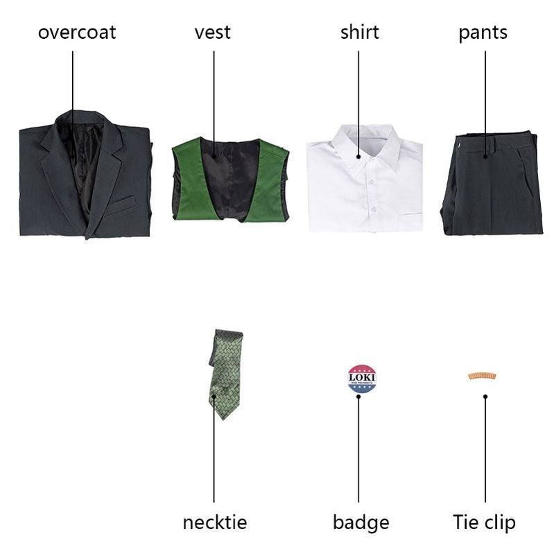 Package Include: Coat, vest, shirt, pants, tie, tie clip, badge