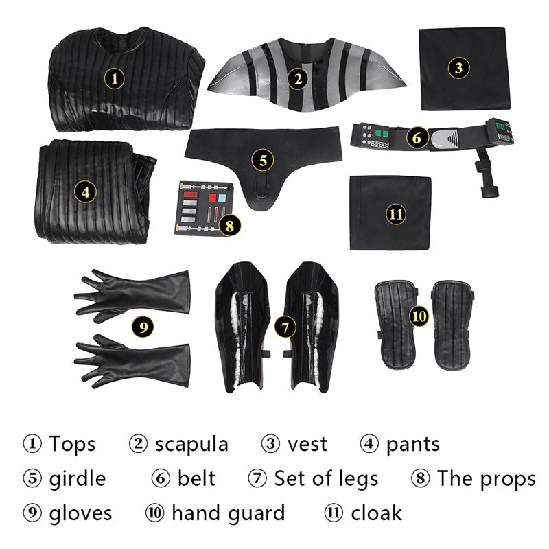 • Package Include:  Top, shoulder armor, vest, pants, girdle, belt, leg cover, chest props, gloves, gauntlets, cape