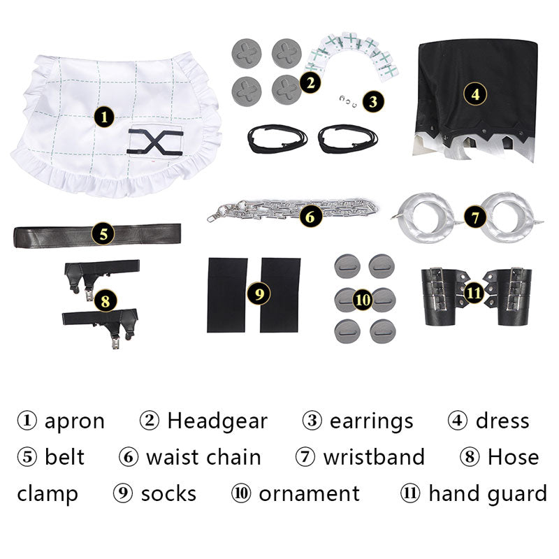• Package Include: Apron, Headwear, Earrings, Dress, Belt, Waist chain, Hand wear, Sock clip, Stockings, Chest accessory, Hand guards