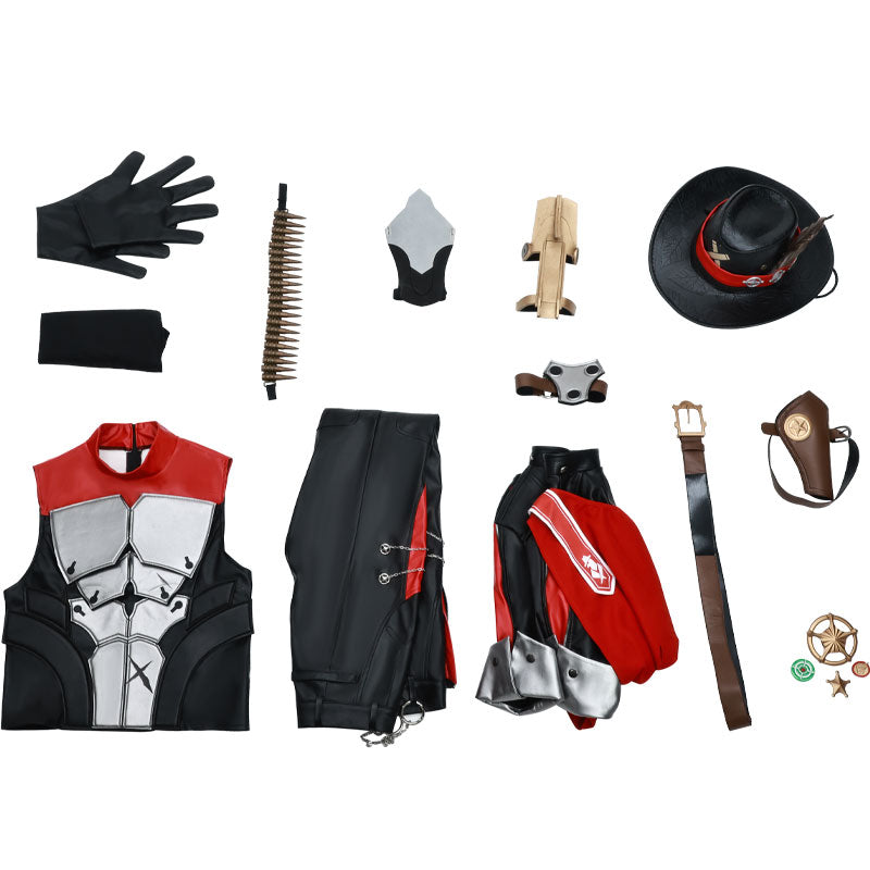 • Package Include: Hat, hatband, jacket, gloves, arm armor, vest, long-sleeved inner wear, prop pin, belt, holster leg strap, bullet clip, pants, knee pads.